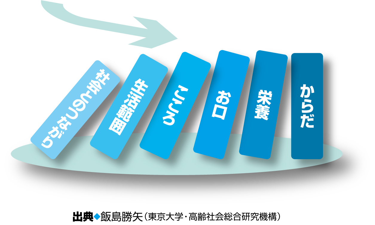 フレイル状態を放置してしまうと3つのフレイルが複合的に重なり合って(フレイルドミノ、下図)、将来の要介護に向けて虚弱化が加速してしまう結果を招いてしまいます。